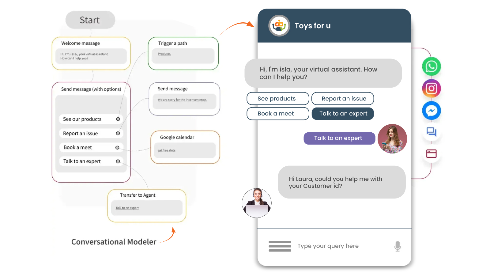 Automate defined Customer Interactions, FAQs, Lead Qualification, Provide Instant Support and 24/7 availability, across all your digital channels and Enable Agents for complex interactions. With HelloBot’s no code flow builder, and Key App Integrations.